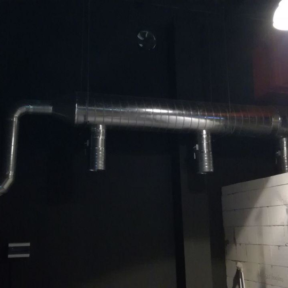 - Система притока оснащена 2-мя электрическими калориферами. Вытяжная система представляет собой 2 ветки, идущие с разных концов помещения, и осуществляющие забор от технологического кухонного оборудования помещений кафе.